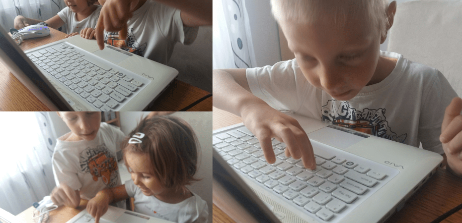 Copiii mei de 4 și 6 ani au început inițierea în utilizarea calculatorului, întrucât au manifestat interes către litere și cifre și către a le scrie, dar și către calculator, am decis că este momentul. În fiecare săptămână petrec 10, respectiv 20 de minute pe laptop, scriind text, jumătate de timp structurat cu indicații de la mine, jumătate din timp liber la apăsat taste după dorința proprie.