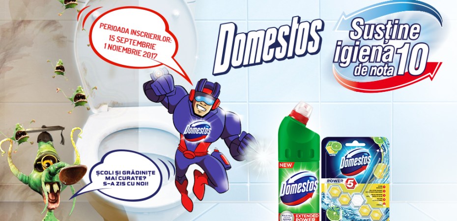 Ce vreau să vă spun acum este că Domestos oferă fonduri și produse de curățenie pentru îmbunătățirea condițiilor de igienă din școli și grădinițe in valoare de peste 40.000 euro, prin campania „Domestos Susține Igiena de Nota 10 în școli și grădinițe!”.