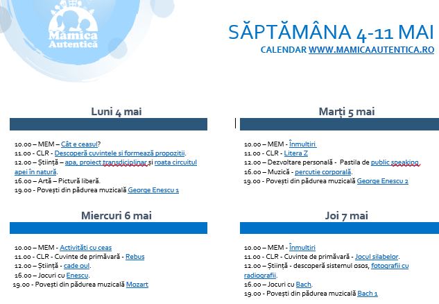 • 10.00 –.Jocuri în familie – Muzeul de acasă – Pe o masă pe care o declarați ”muzeu”, puneți-i să așeze diverse obiecte din casă care vorbesc despre trecutul familiei voastre. (nu le dați idei, lăsați-i să-și bată capul; ele pot fi: fotografii vechi, obiecte care au aparținut bunicii, haine din prima lor copilărie etc). Rugați-i, la final, să vă fie ghid. Aduceți și voi obiecte de când erau ei mici și povestiți-le despre cum erau ei bebeluși.
