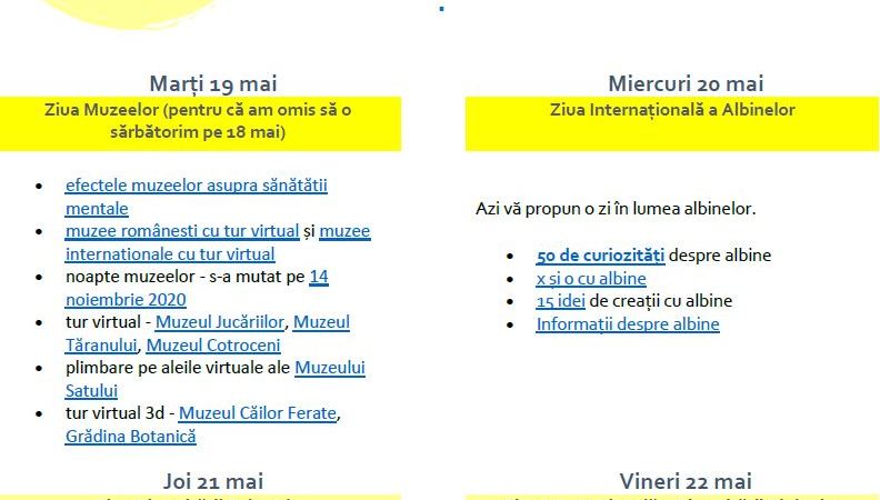 Începând din 18 mai am trecut la starea de alertă, unii dintre noi ne-am reîntors la birouri, copiii mai au de așteptat, deci continuăm școala online. Până acum s-a rulat aproape o lună de școală online obligatorie (instituită după Paște, căci înainte de vacanță nu toți au lucrat ceva organizat). Asta înseamnă că toți aveți deja orarul mai clar și o structură a orelor zilnice. Pentru acest motiv calendarul se va schimba, în încercarea de a vă oferi resurse relevante și utile, complementare și mai altfel, fără a își propune să înlocuiască activitățile oferite de cadrele didactice.