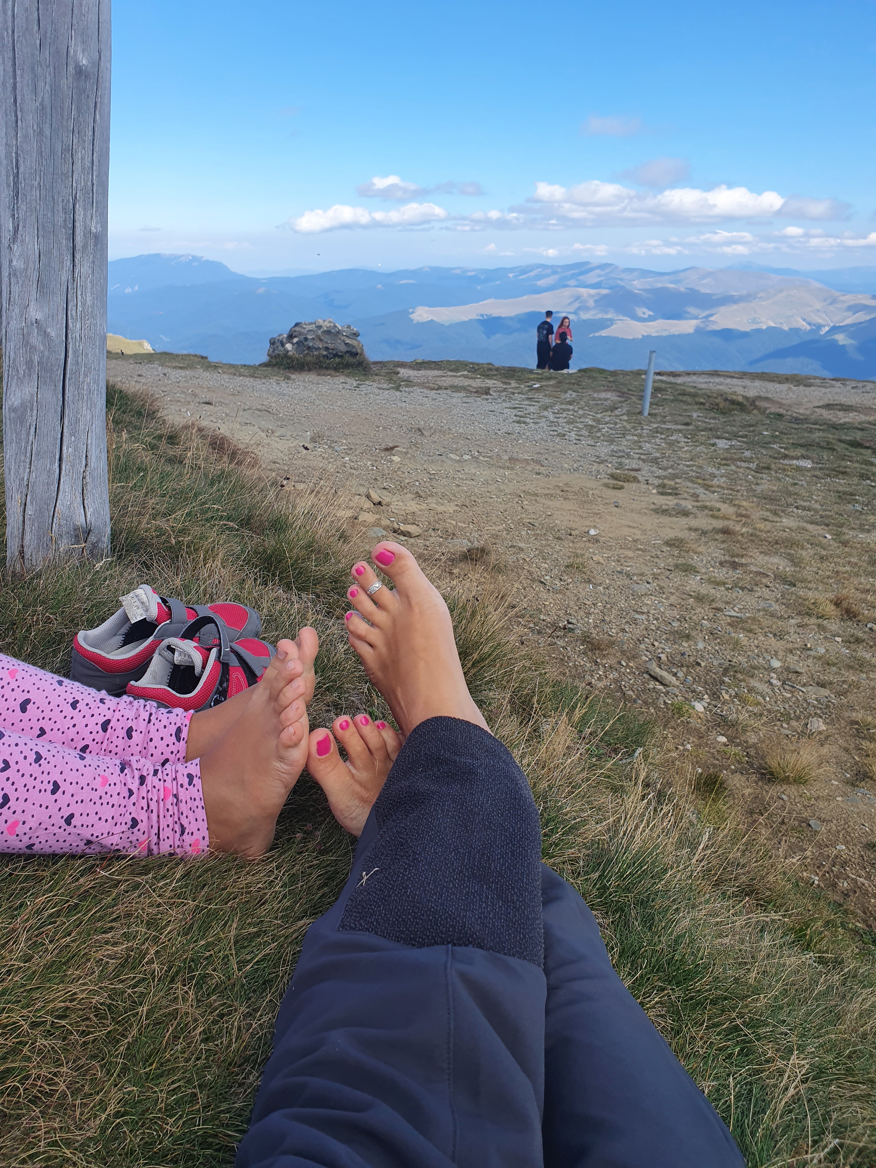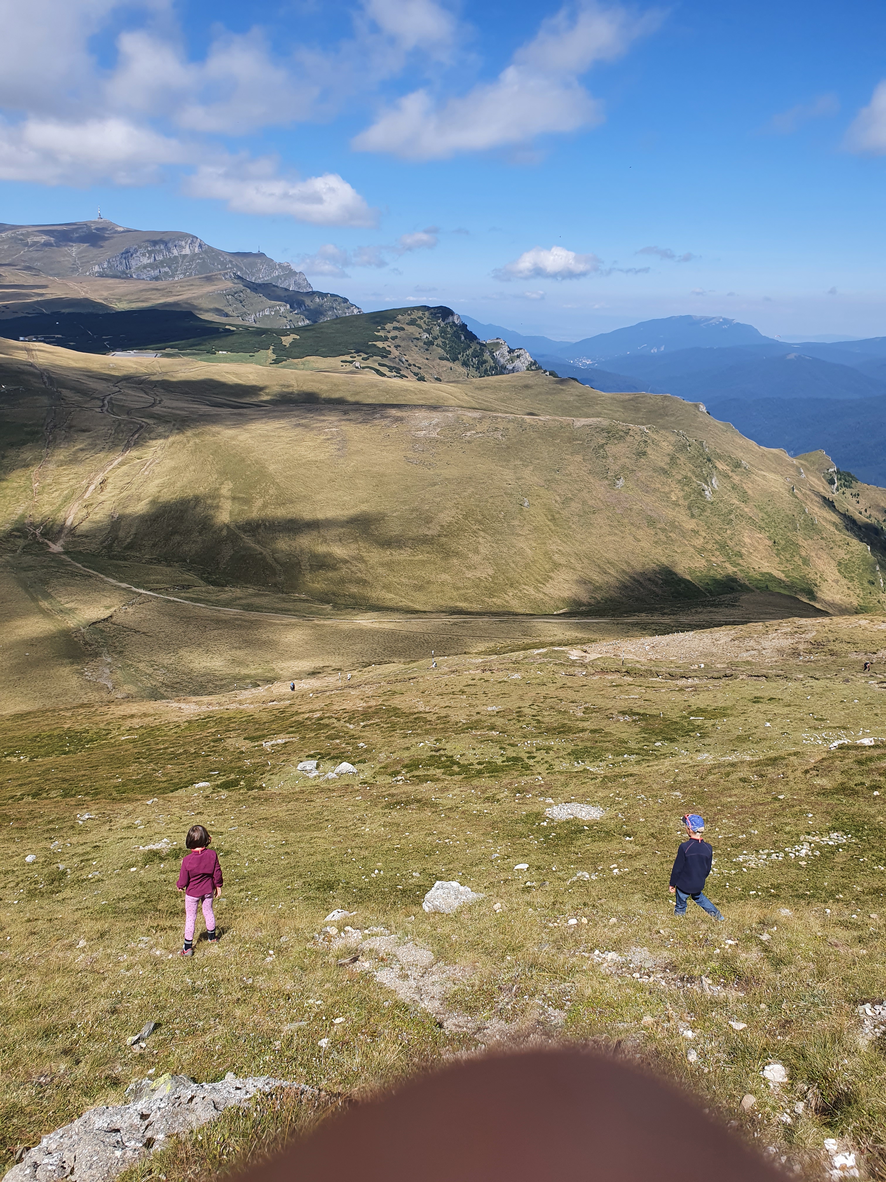 Am petrecut pe platou 3h absolut magice, admirând peisajul (la propriu), simțind muntele cu tălpile goale (la propriu), făcând poze și, cel mai mult, eu stând degeaba, ei doi jucându-se cu pietre. S-ar fi putut juca acolo sus pe platou o zi întreagă cu acele pietre. Trebuia să iau și acasă că poate or fi magice, aici nu le ajung jucăriile, darămite să se joace doar cu pietre… sau o fi aerul.