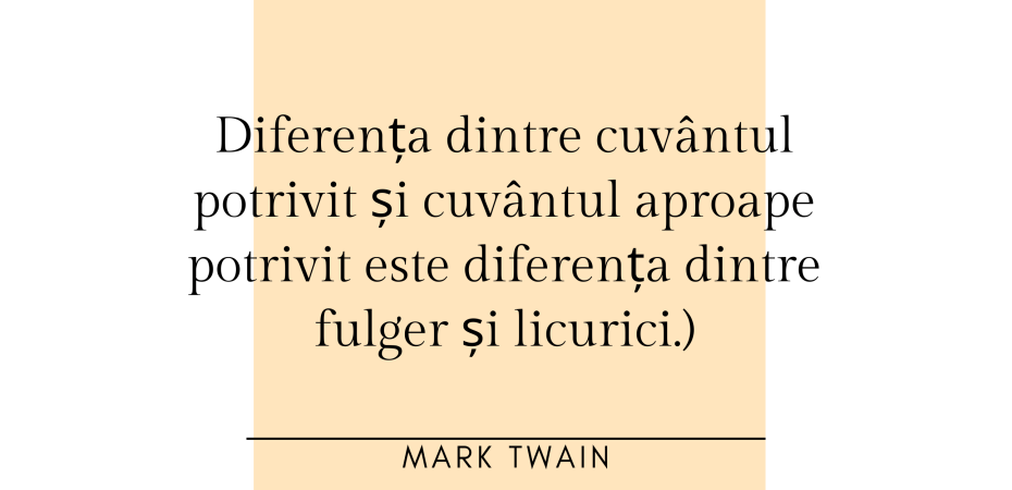 The difference between the right word and the almost right word is the difference between lightning and a lightning bug. (Diferența dintre cuvântul potrivit și cuvântul aproape potrivit este diferența dintre fulger și licurici.)
